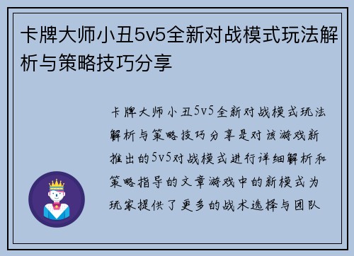 卡牌大师小丑5v5全新对战模式玩法解析与策略技巧分享